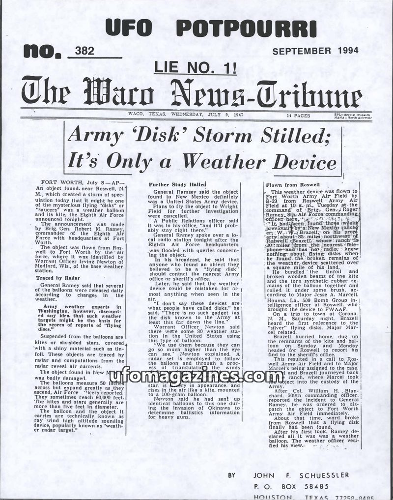 The September 1994 issue of UFO Potpourri addresses the 1947 Roswell incident, presenting the Air Force's explanation that the wreckage was from Project Mogul, a secret high-altitu