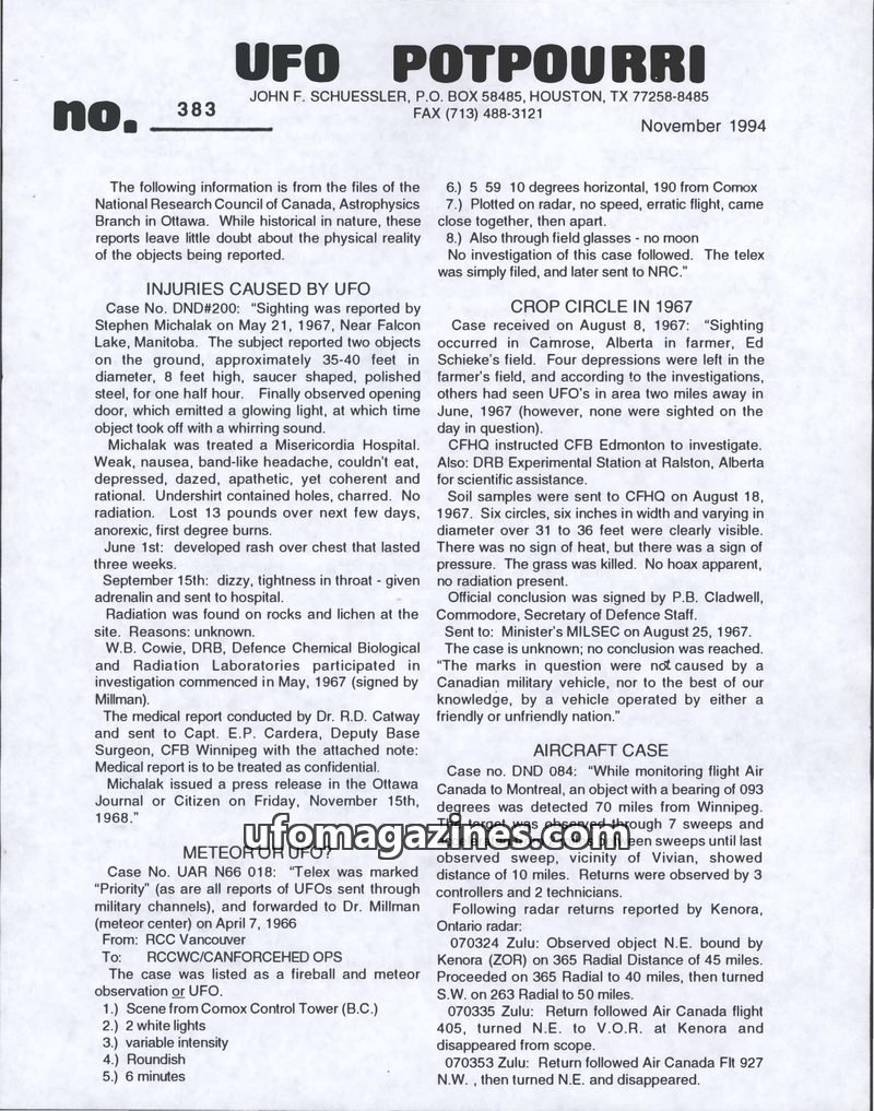 This issue of UFO Potpourri from November 1994 compiles historical UFO reports, primarily from Canadian sources, investigated by organizations like the National Research Council of