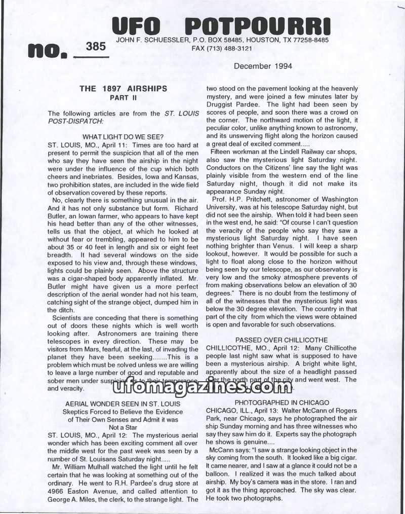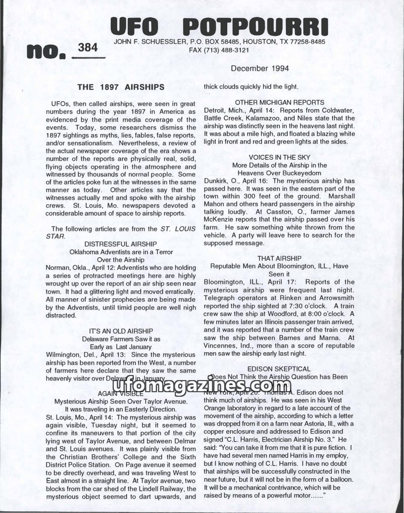 This issue of UFO Potpourri focuses on the 1897 airship phenomenon, compiling reports from the St. Louis Post-Dispatch. Eyewitnesses across Missouri, Iowa, Kansas, Illinois, Oklaho