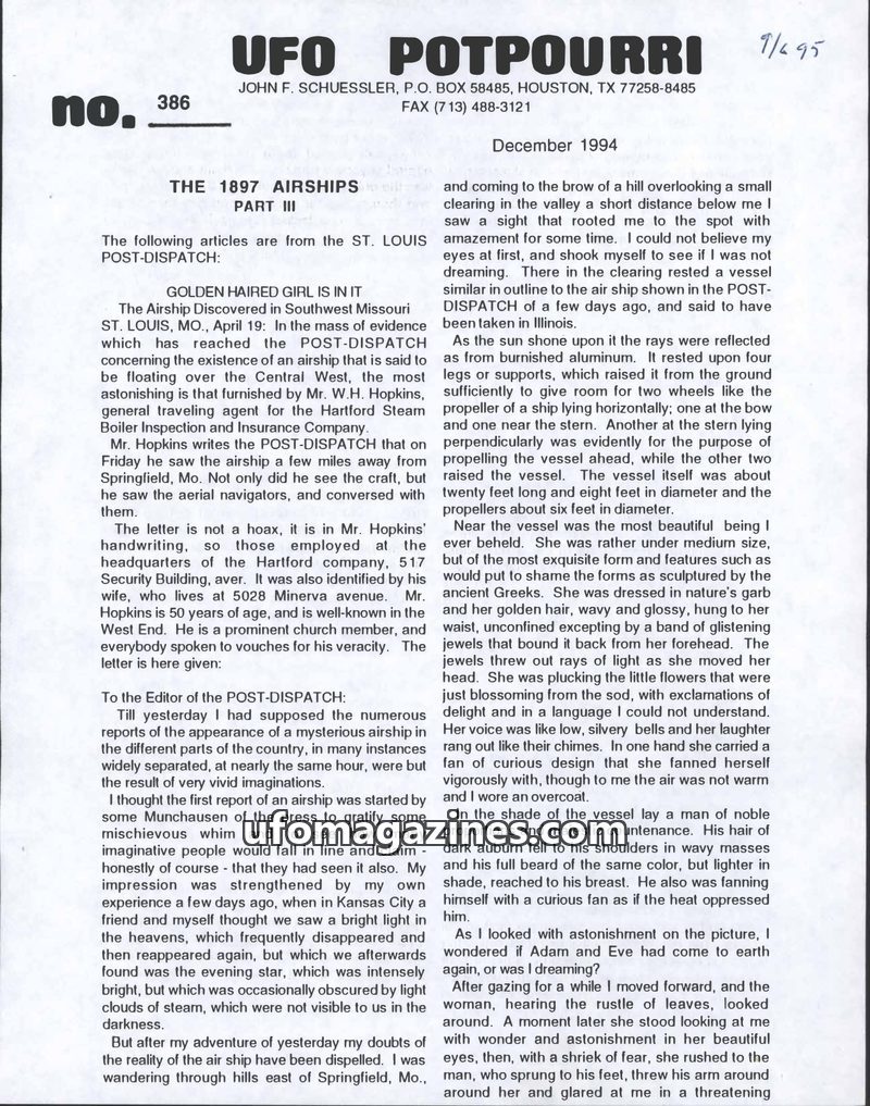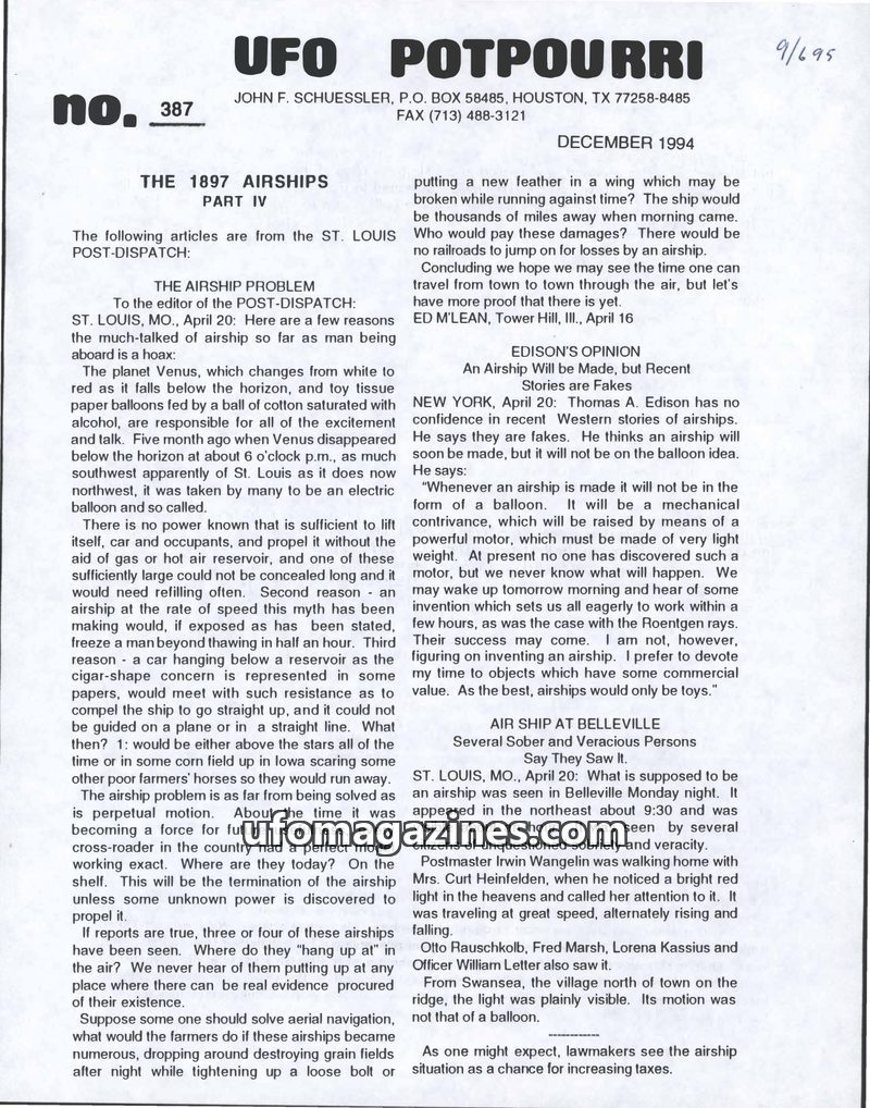 This issue of UFO Potpourri delves into the 1897 airship craze, presenting a collection of articles and reader letters from the ST. LOUIS POST-DISPATCH. A reader from Tower Hill, I