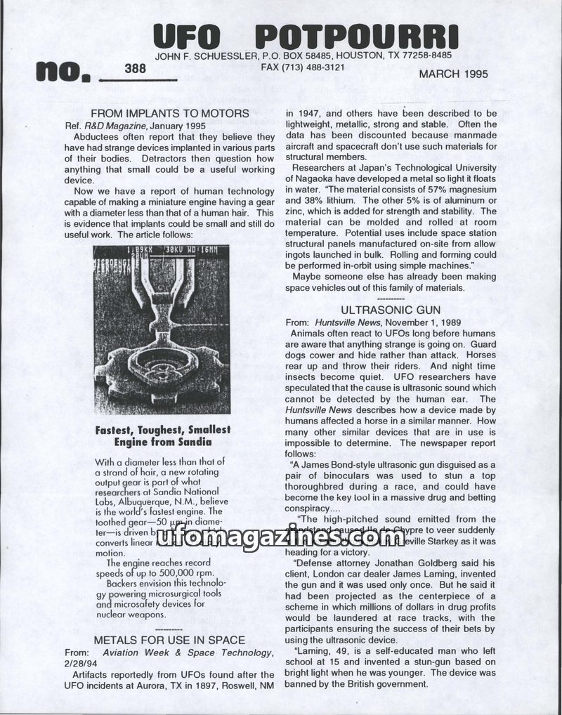 This issue of UFO Potpourri covers several intriguing topics. It reports on a miniature engine from Sandia National Labs capable of 500,000 rpm, potentially useful for microsurgery
