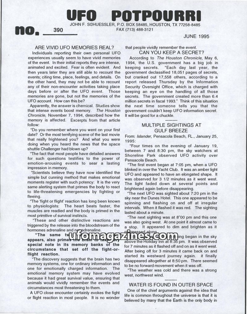This issue of UFO Potpourri delves into the nature of vivid UFO memories, suggesting they are enhanced by the 'fight or flight' response and hormonal reactions. It also touches upo