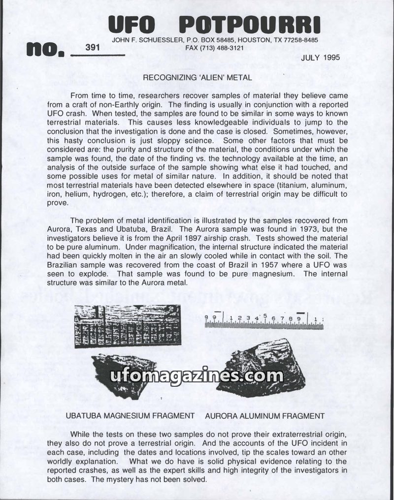 This issue of UFO Potpourri investigates metallic samples from alleged UFO incidents in Aurora, Texas (1897 airship crash) and Ubatuba, Brazil (1957 UFO explosion). Tests revealed