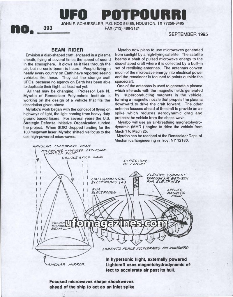 This issue of UFO Potpourri discusses Professor Leik N. Myrabo's 'Beam Rider' concept for a plasma-sheathed, microwave-powered craft capable of hypersonic flight. It also delves in