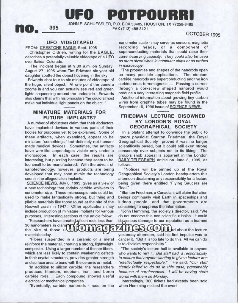 This issue of UFO Potpourri covers several UFO sightings, including a videotaped incident in Colorado where a child filmed a large, silent object. It also discusses nanotechnology'