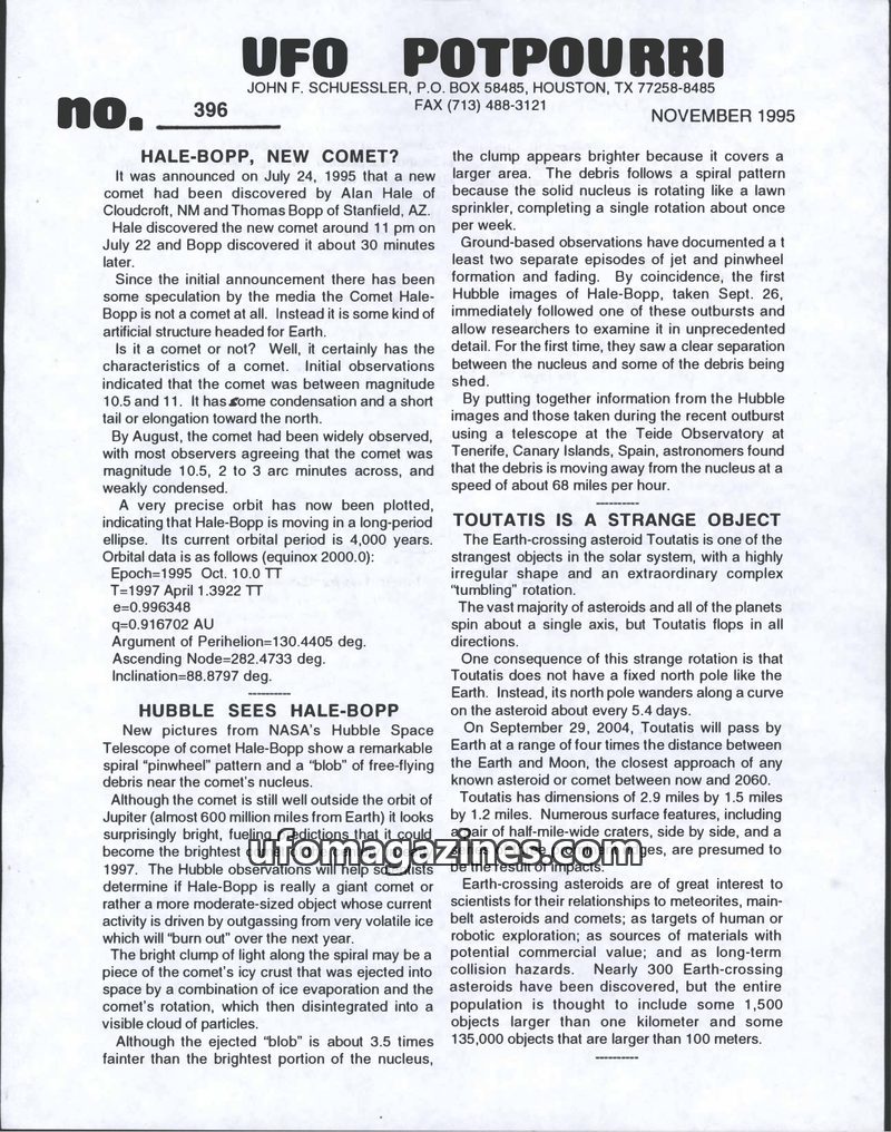 This issue of UFO Potpourri from November 1995 covers the newly discovered comet Hale-Bopp, detailing its characteristics, orbital data, and observations from the Hubble Space Tele