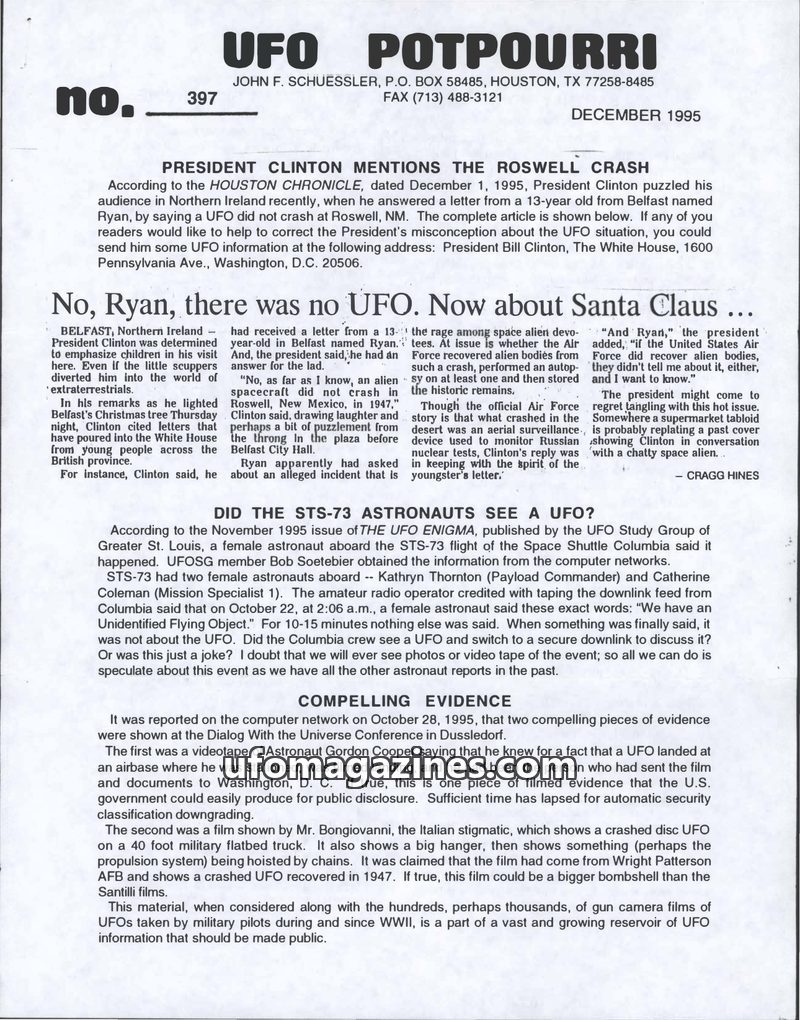 This issue of UFO Potpourri covers President Clinton's denial of a UFO crash at Roswell, NM, despite public perception. It also details a potential UFO sighting by the STS-73 astro