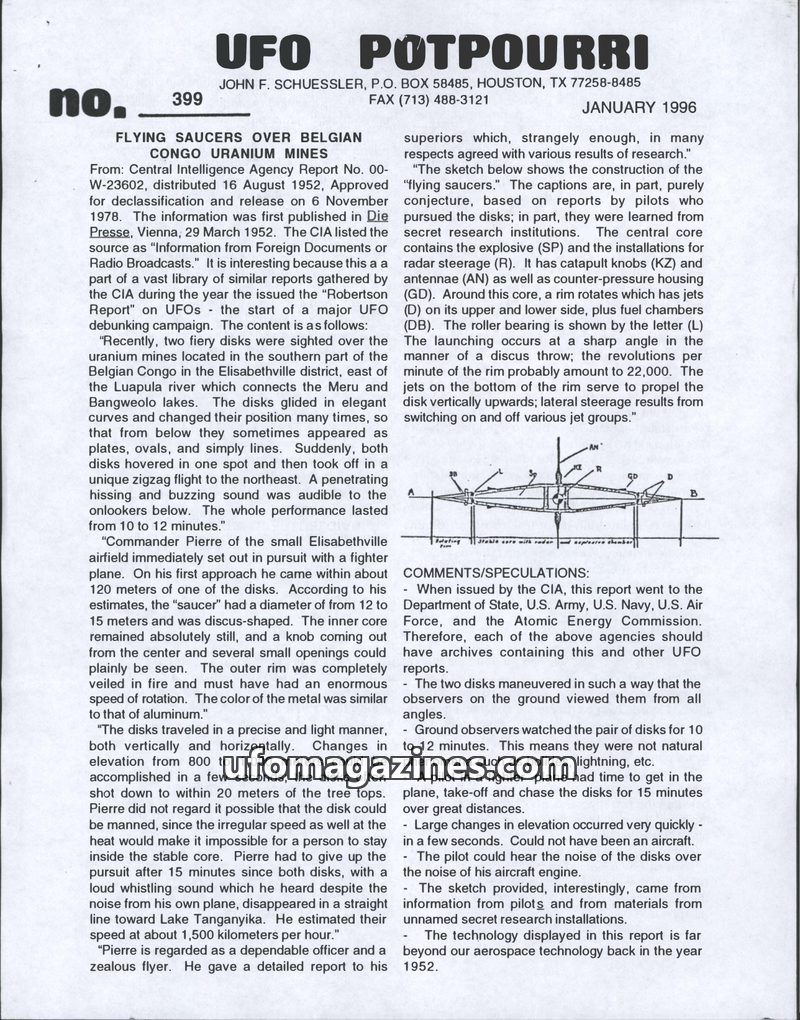 This issue of UFO Potpourri features two significant UFO reports. The first details a sighting over Belgian Congo uranium mines in the 1950s, involving two fiery disks with advance