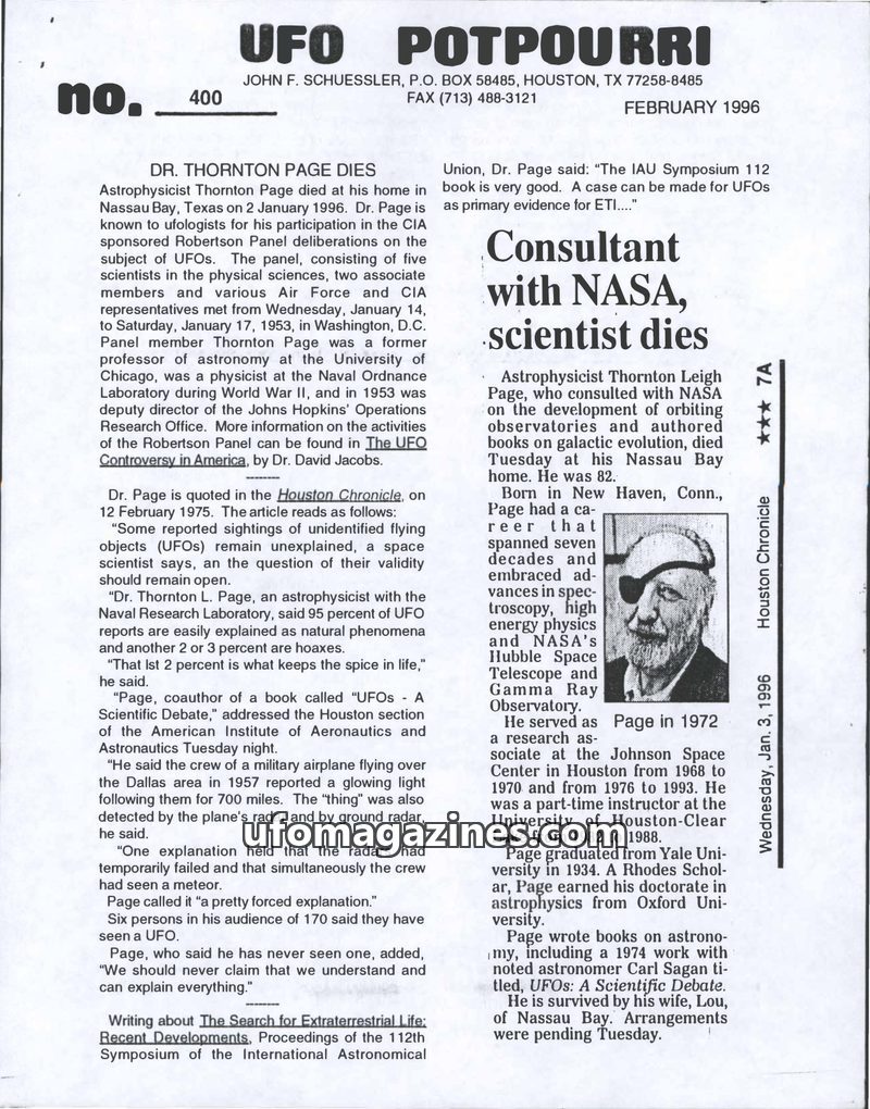 This issue of UFO Potpourri reports on the death of astrophysicist Thornton Page, a key figure in the CIA-sponsored Robertson Panel on UFOs. Page believed that while most UFO repor