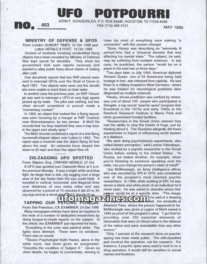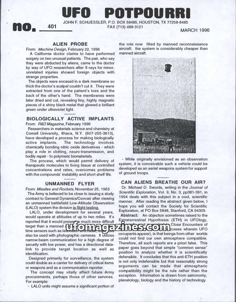 This issue of UFO Potpourri covers a range of UFO-related topics from early 1996. It features a report on a doctor who allegedly removed alien probe objects from patients, research
