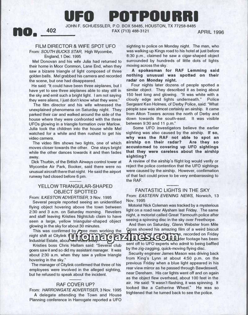 This issue of UFO Potpourri from April 1996 details multiple UFO sightings across England. Reports include a film director and his wife witnessing a triangular formation of lights,