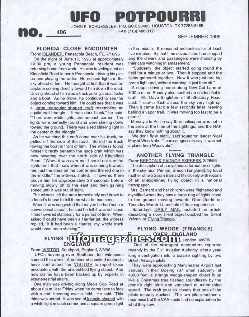 This issue of UFO Potpourri features several witness accounts of unidentified flying objects, primarily in Florida and England, during 1996. Reports include a large triangular craf