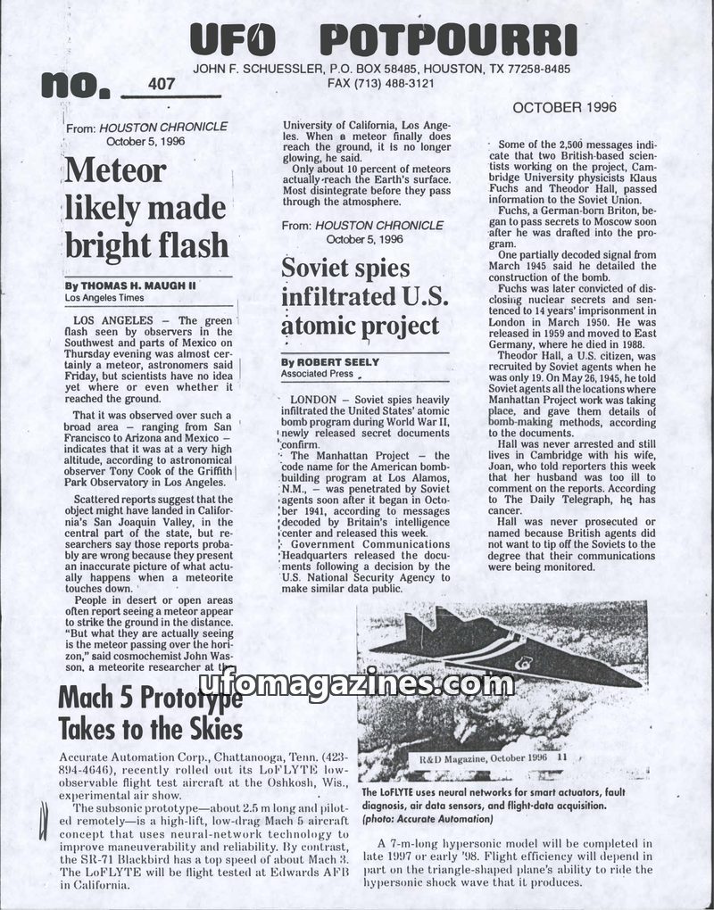 This issue of UFO Potpourri (October 1996) reports on a bright meteor flash observed over a wide area, with astronomers confirming it was likely a meteor but uncertain of its landi