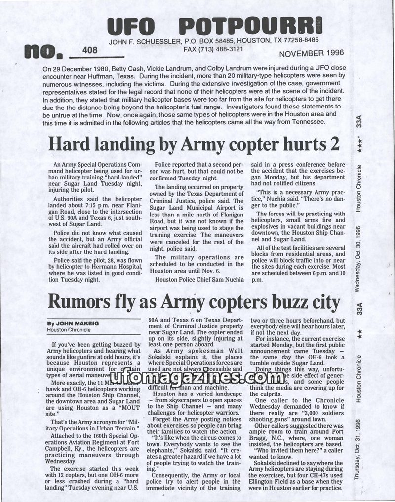 This issue of UFO Potpourri details a hard landing of an Army helicopter during urban terrain training in Sugar Land, Texas, which led to injuries and rumors. It also revisits the