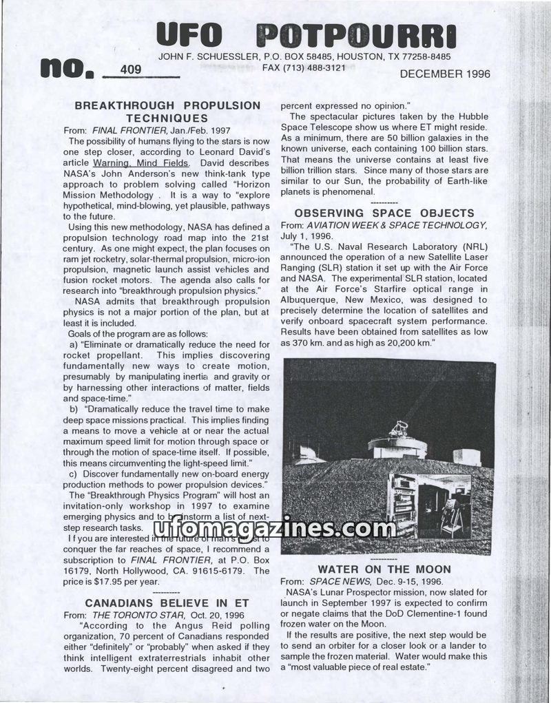 This issue of UFO Potpourri covers advancements in space exploration and extraterrestrial topics. It details NASA's 'Horizon Mission Methodology' aimed at developing new propulsion