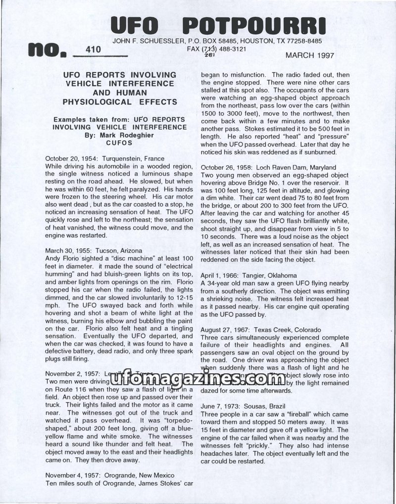 This issue of UFO Potpourri presents a collection of UFO reports from 1954 to 1973, focusing on incidents involving vehicle interference and human physiological effects. Cases from