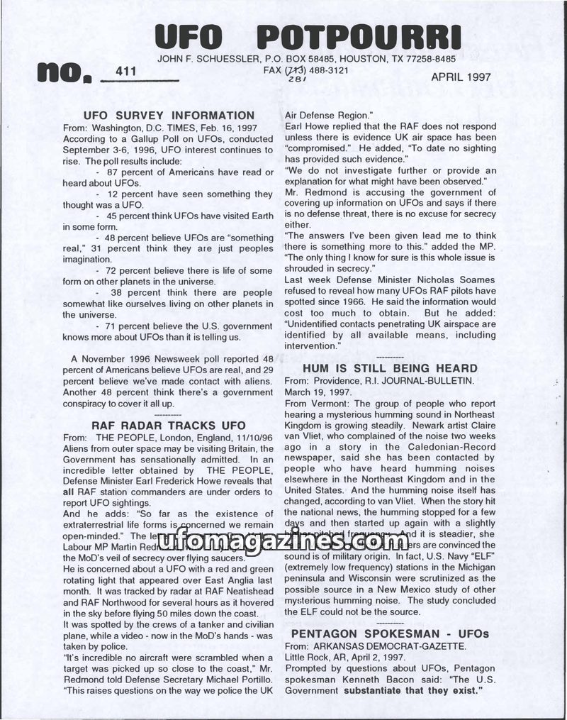 This issue of UFO Potpourri from April 1997 covers a range of UFO-related topics. A Gallup Poll from September 1996 indicates high public interest in UFOs, with a majority believin