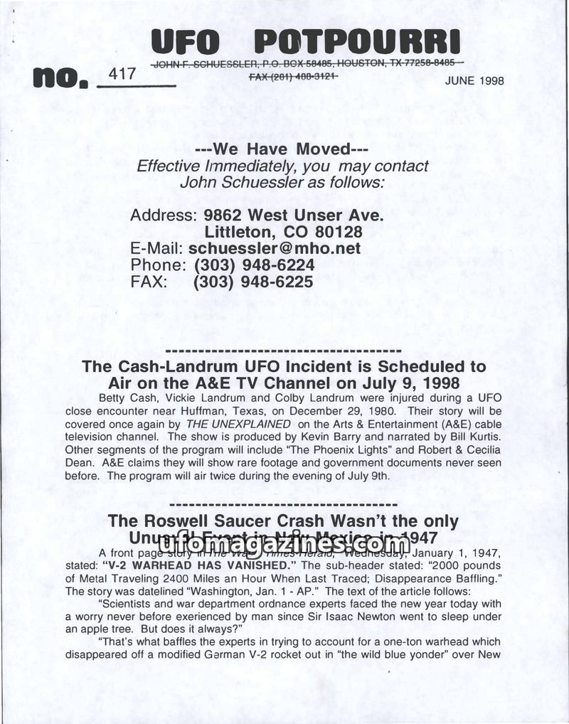 This June 1998 issue of UFO Potpourri announces an upcoming A&E TV special on the Cash-Landrum UFO Incident of December 29, 1980, detailing the injuries sustained by Betty Cash, Vi