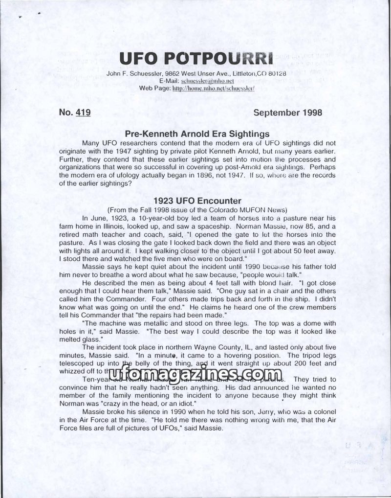 This issue of UFO Potpourri focuses on UFO sightings predating the famous 1947 Kenneth Arnold encounter, suggesting the modern era of ufology began much earlier. It details several
