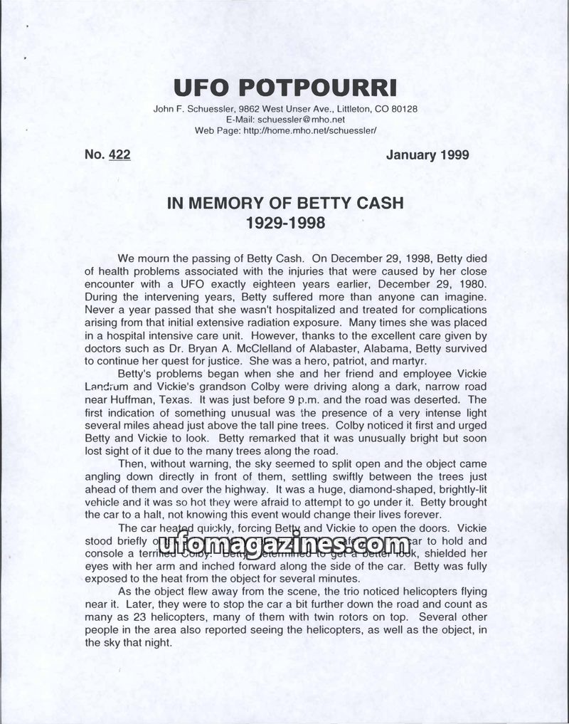This issue memorializes Betty Cash, who died on December 29, 1998, from health problems linked to a UFO encounter on December 29, 1980. During the incident near Huffman, Texas, Bet