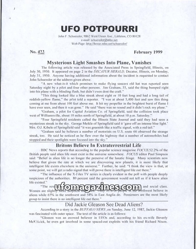 This issue of UFO POTPOURRI reports on a 1950 incident where a pilot and witnesses saw a mysterious light that collided with a plane. It also covers a survey indicating a majority