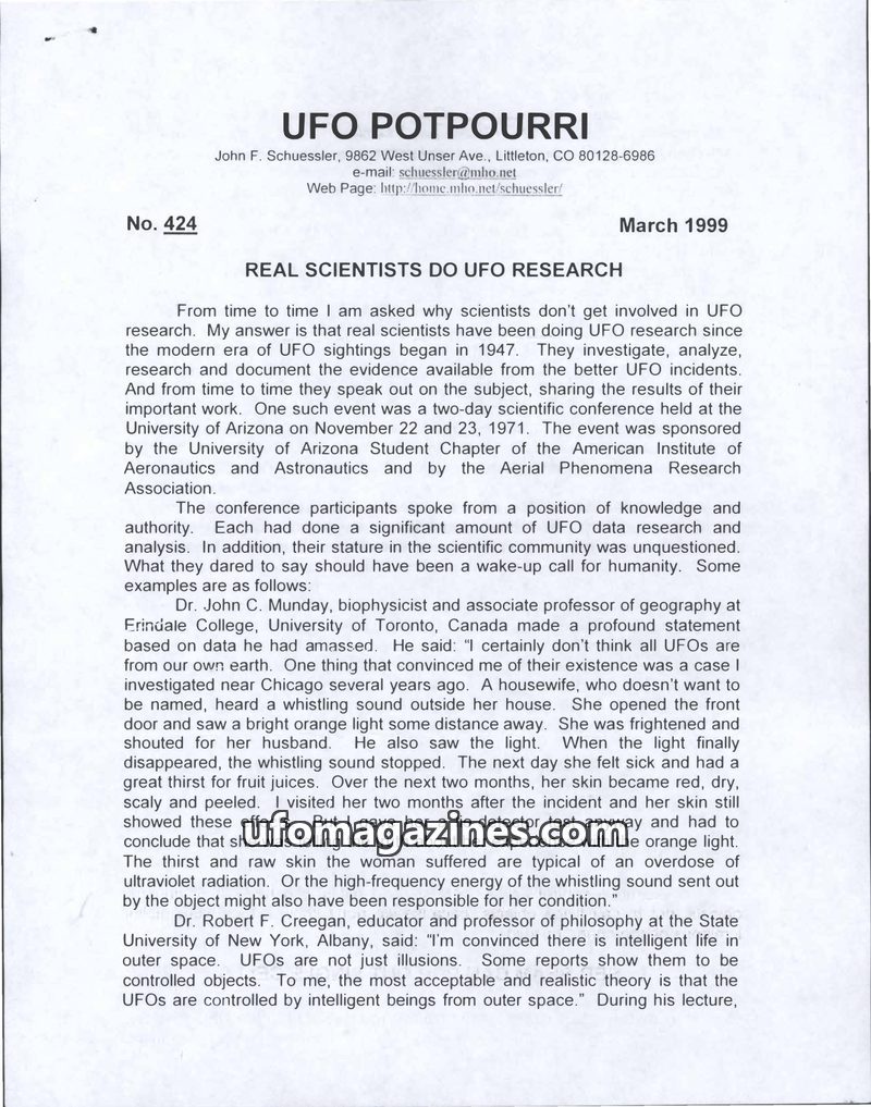 This issue of "UFO Potpourri" highlights that real scientists have been actively researching UFOs since 1947, presenting evidence and analysis from scientific conferences. Several