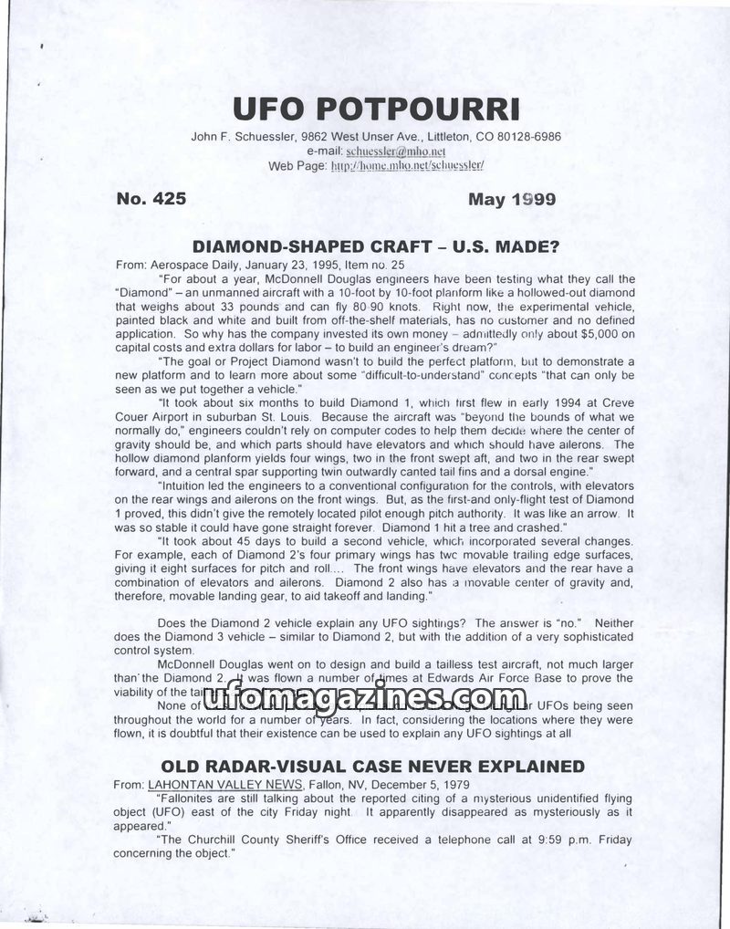 This issue of UFO Potpourri delves into the development of McDonnell Douglas's experimental 'Diamond' aircraft, designed to test difficult-to-understand aerodynamic concepts, thoug