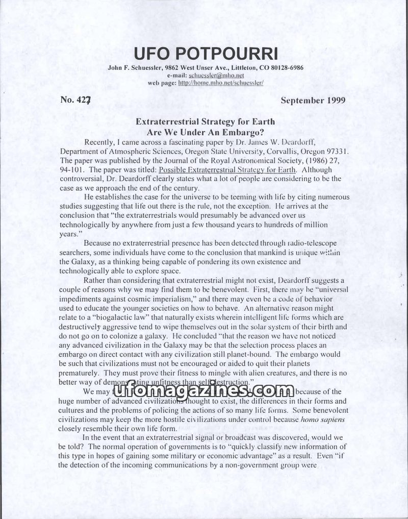 This issue of UFO POTPOURRI discusses Dr. James W. Deardorff's paper, 'Possible Extraterrestrial Strategy for Earth,' which posits that the lack of detected extraterrestrial presen