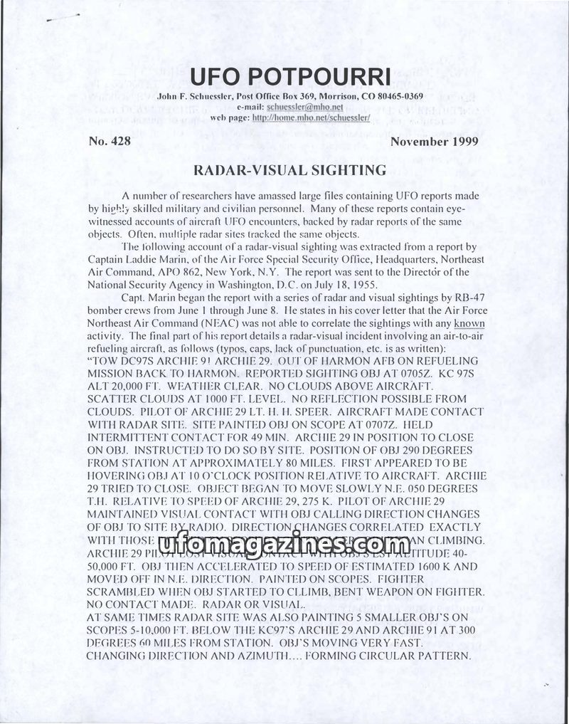 This issue of UFO Potpourri details a radar-visual sighting from July 1955, extracted from a report by Captain Laddie Marin of the Air Force. Multiple RB-47 bomber crews reported s