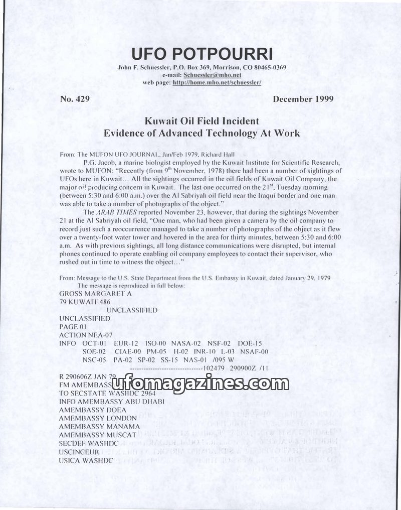 This issue of UFO Potpourri details the Kuwait Oil Field Incident of late 1978, where multiple UFO sightings occurred over Kuwait Oil Company fields. An investigation by the Kuwait