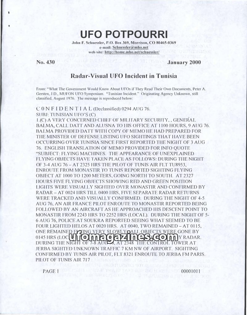 This issue details a significant Radar-Visual UFO Incident that occurred in Tunisia during August 1976. A confidential memo, later declassified, outlines multiple sightings by pilo