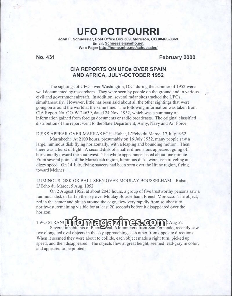 This issue of UFO Potpourri, dated February 2000, presents a summary of CIA Report No. OO-W-24639 from November 1952, detailing UFO sightings across Spain and Africa during July-Oc