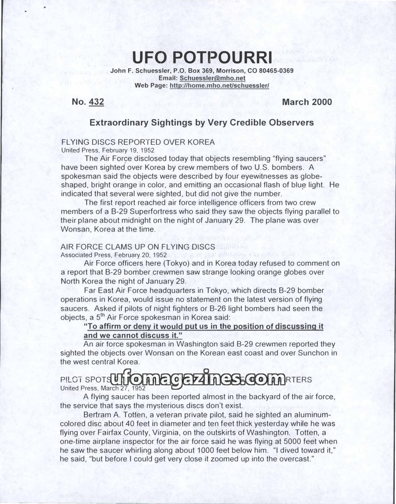 This issue of UFO Potpourri details several extraordinary sightings of unidentified flying objects by credible observers. Reports include B-29 bomber crewmen in Korea describing or