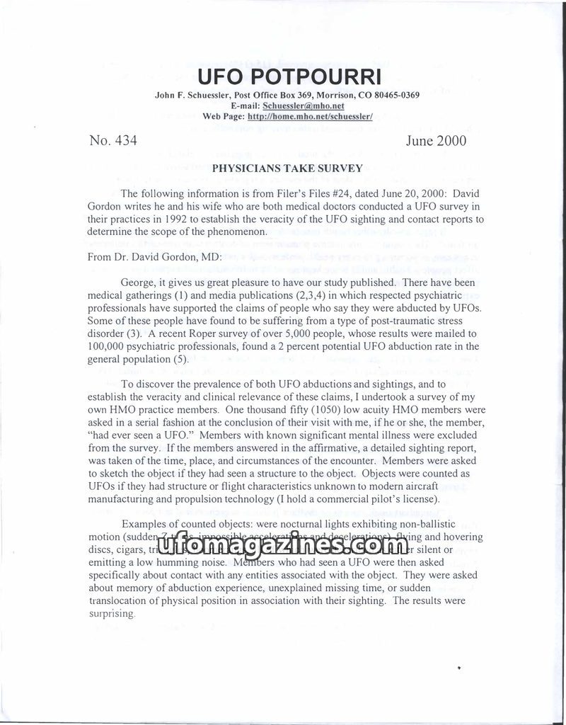 This issue of UFO POTPOURRI presents findings from a 1992 survey conducted by medical doctors David and wife Gordon, which indicated that 11% of their HMO members had seen a UFO, w