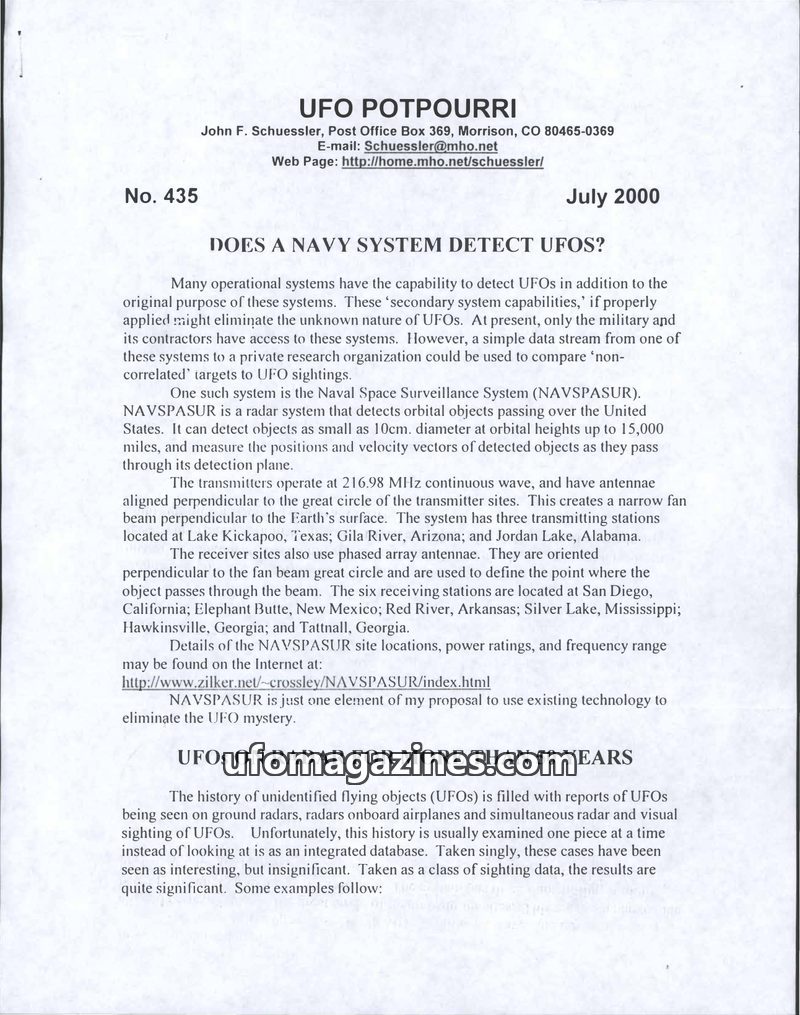 This issue of UFO Potpourri explores the possibility that the Naval Space Surveillance System (NAVSPASUR), designed to track orbital objects, could also detect UFOs. It details NAV