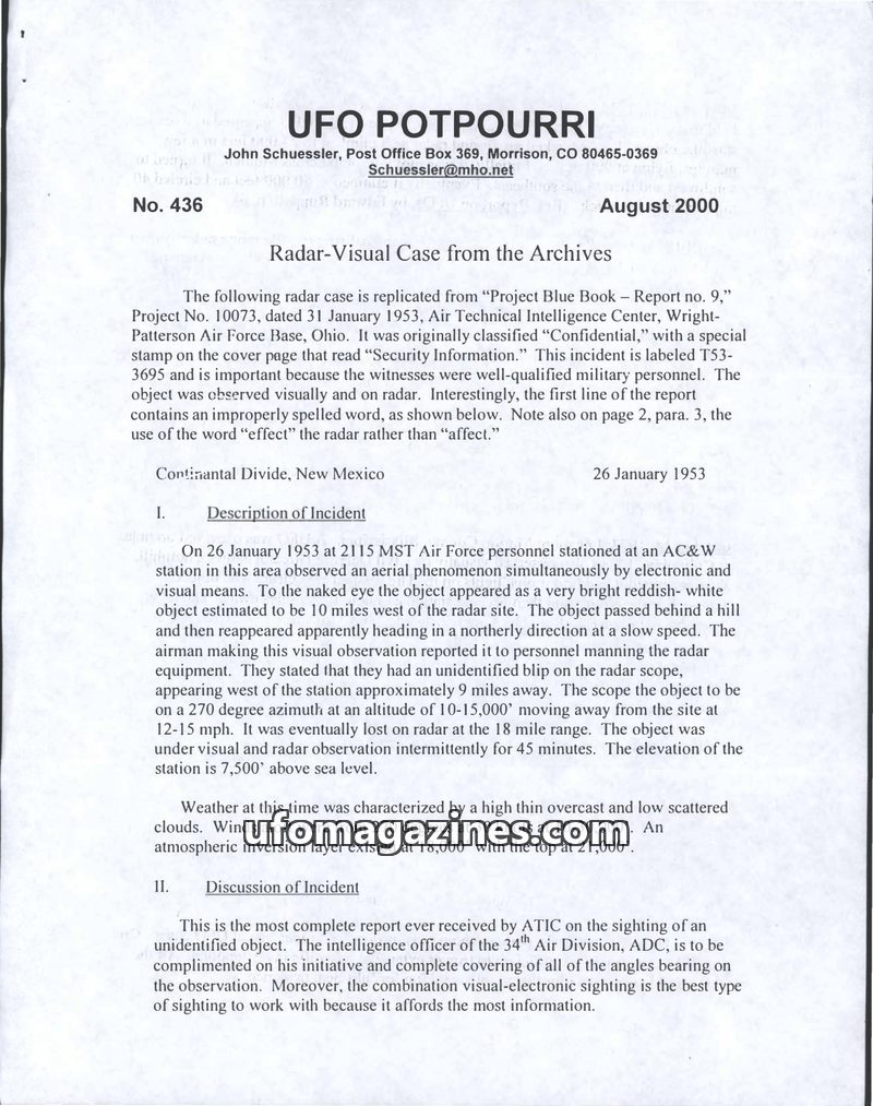 This issue of UFO POTPOURRI details a radar-visual UFO case from Project Blue Book, Report no. 9, dated January 31, 1953. The incident occurred on January 26, 1953, near the Contin