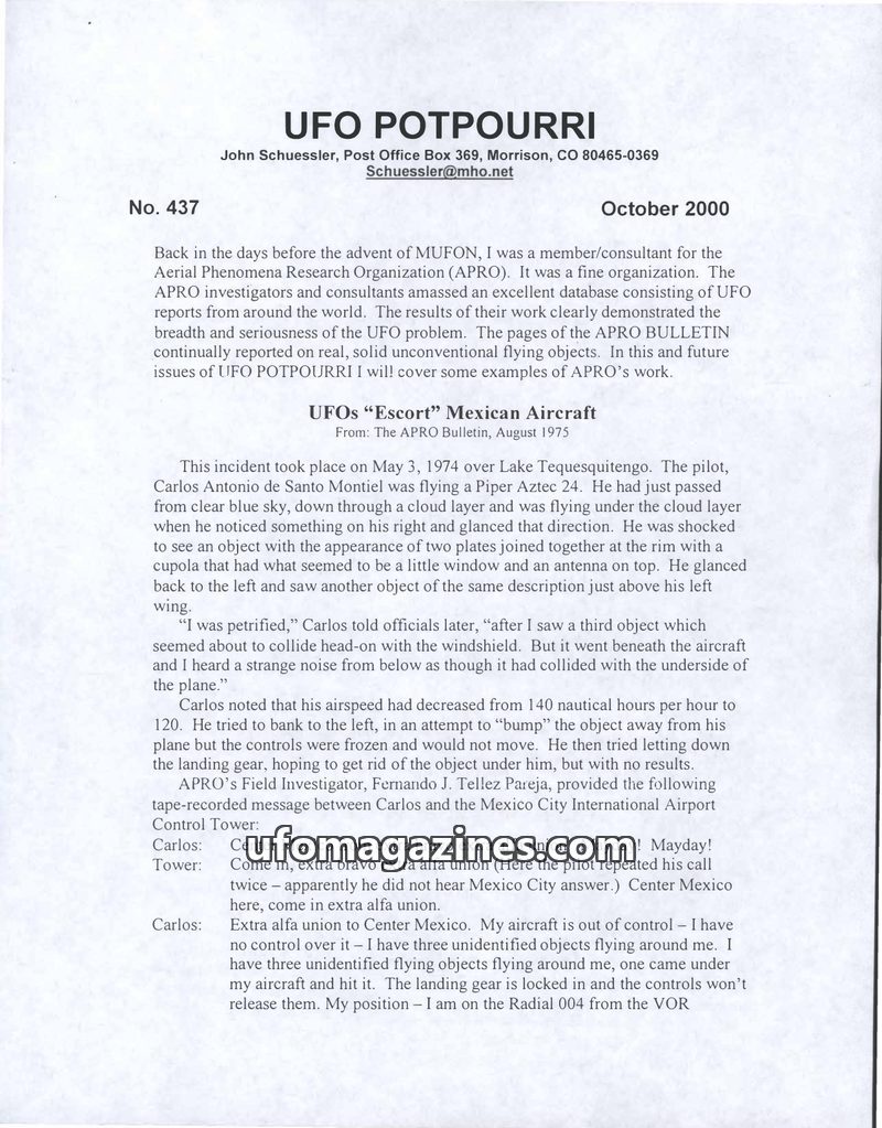 This issue of UFO POTPOURRI, dated October 2000, features two significant UFO incidents from the APRO archives. The first details an encounter on May 3, 1974, over Lake Tequesquite
