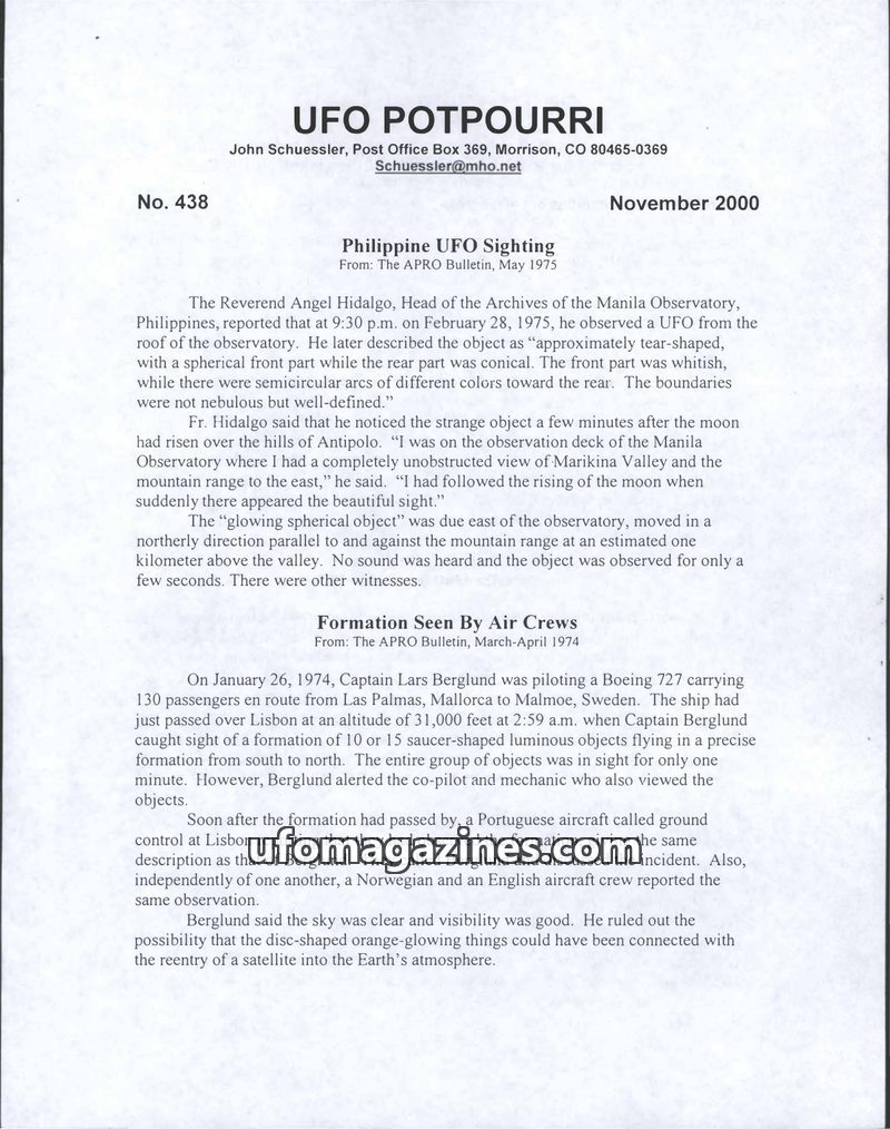 This issue of UFO Potpourri presents several UFO sighting reports from the 1970s and late 1960s. It details a sighting by Reverend Angel Hidalgo in the Philippines in 1975, describ