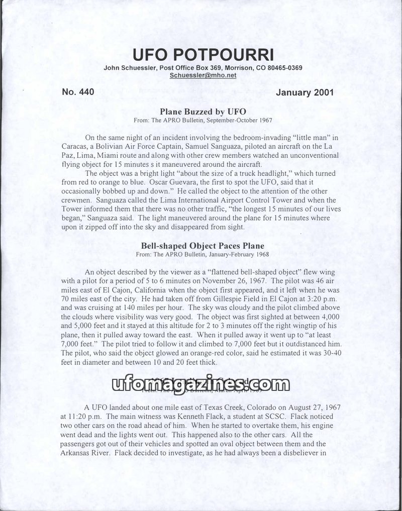 This issue of UFO Potpourri, dated January 2001, compiles several UFO sighting reports from the late 1960s and early 1970s. Incidents include a Bolivian Air Force plane being buzze