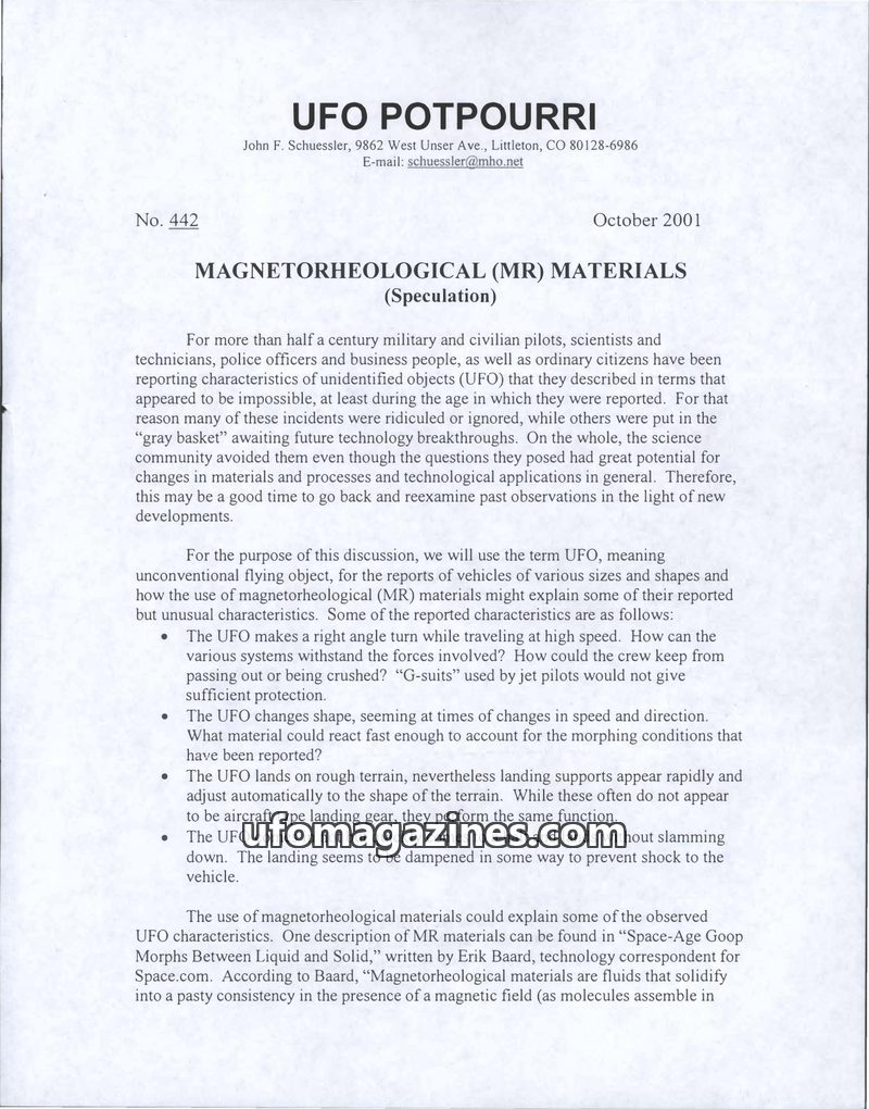 This issue speculates on how Magnetorheological (MR) materials might explain previously inexplicable UFO characteristics. It details reported UFO behaviors like sharp turns, shape