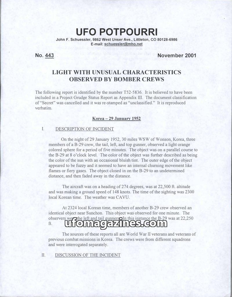 This issue of UFO POTPOURRI details a report (T52-5836) originally from Project Grudge concerning a UAP sighting over Korea on January 29, 1952. Three B-29 crew members observed a