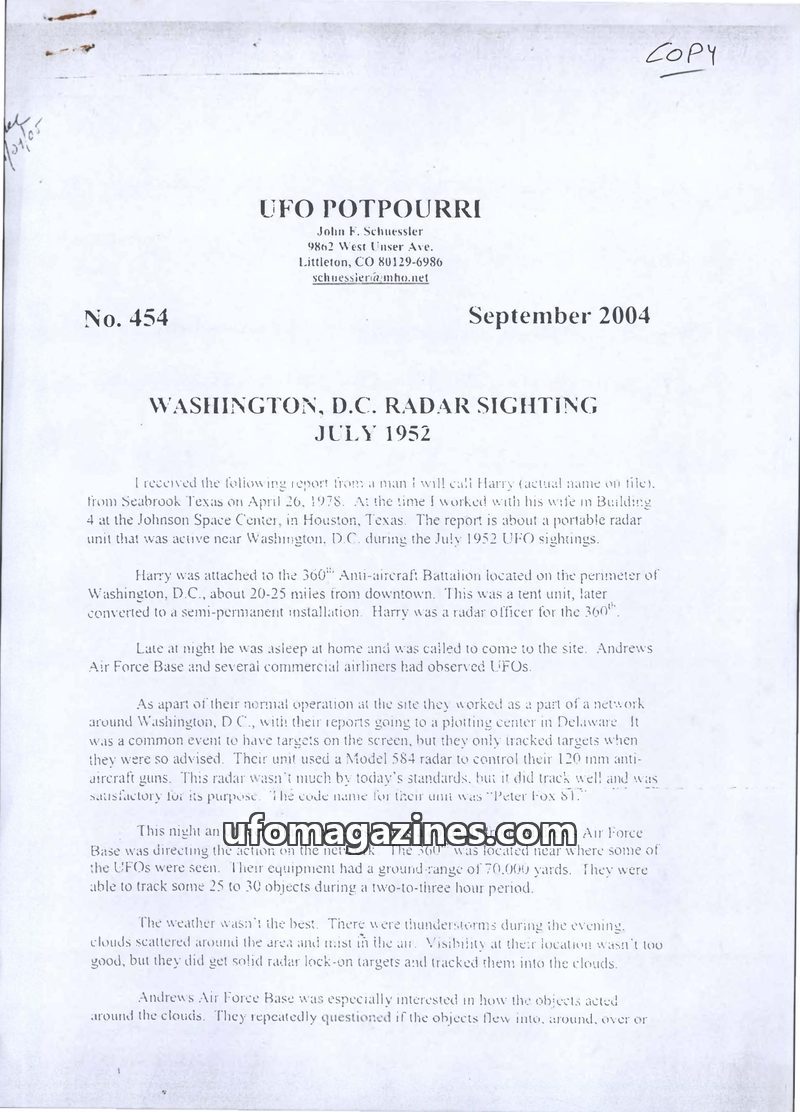 This issue details a radar sighting from July 1952 near Washington D.C., reported by a former radar officer named Harry. His unit, the 360th Anti-aircraft Battalion, tracked 25-30