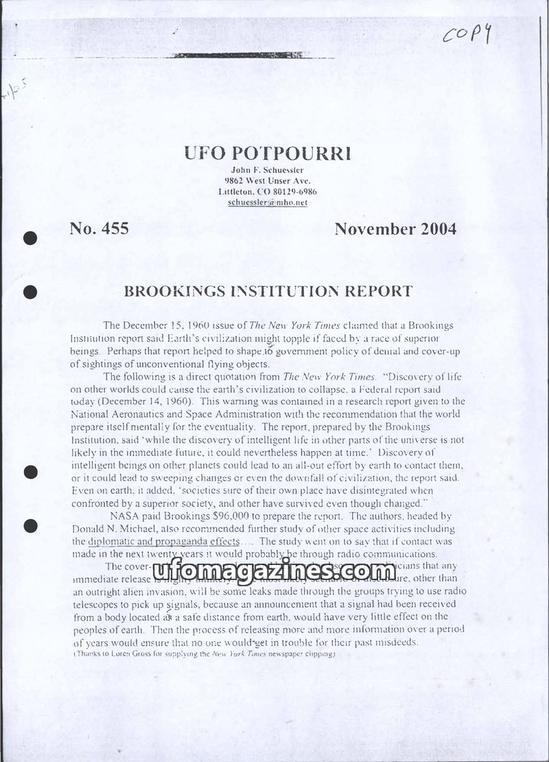 This issue of UFO Potpourri features a 1960 Brookings Institution report to NASA that cautioned about the potential collapse of Earth's civilization upon discovery of superior alie