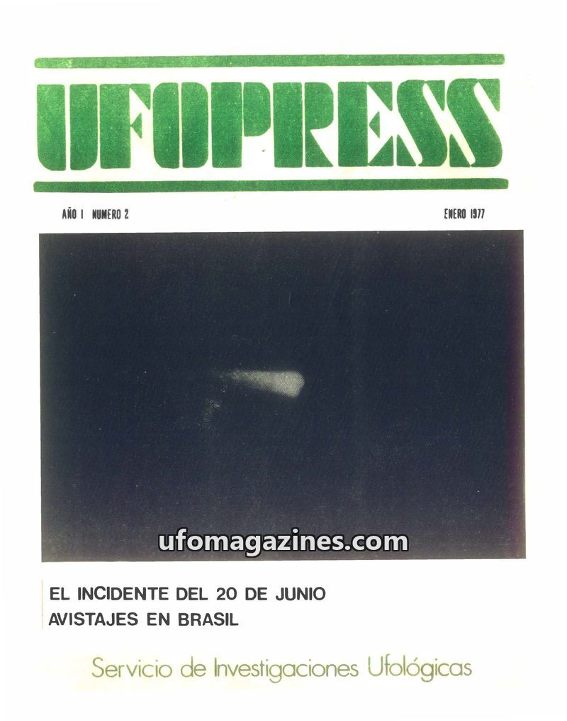 This issue of UFOPRESS, published in January 1977, focuses on UFO phenomena in Brazil, particularly the incident of June 20th. It includes an editorial discussing the debate betwee