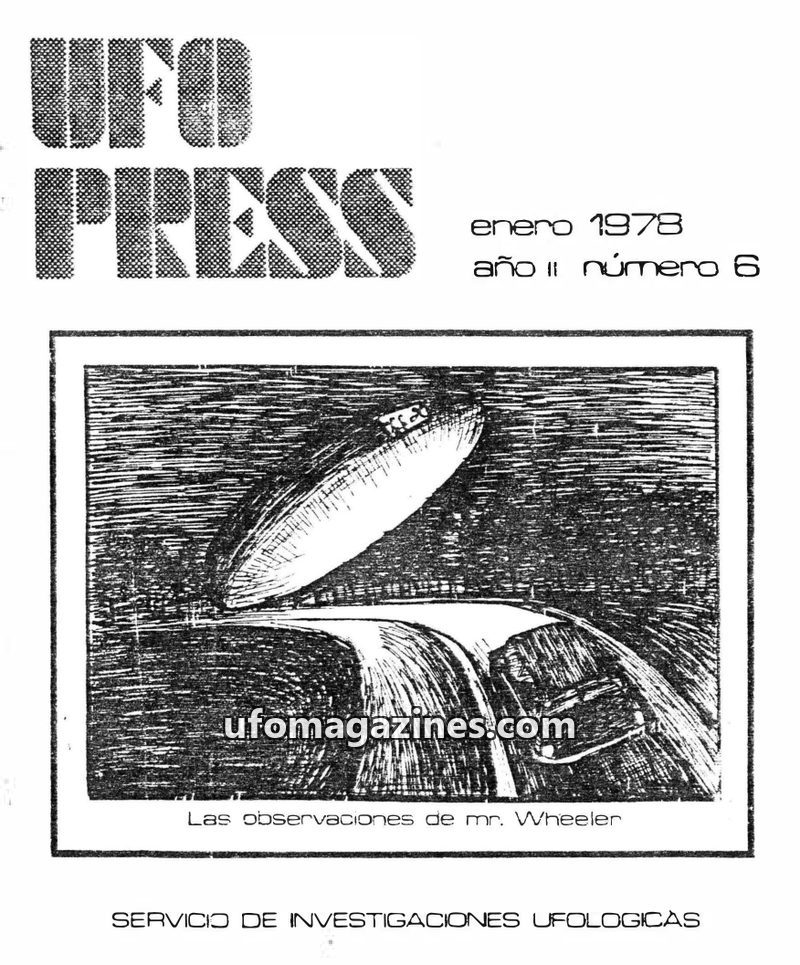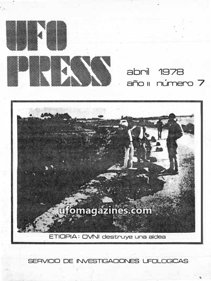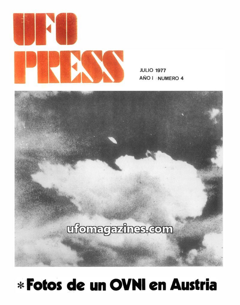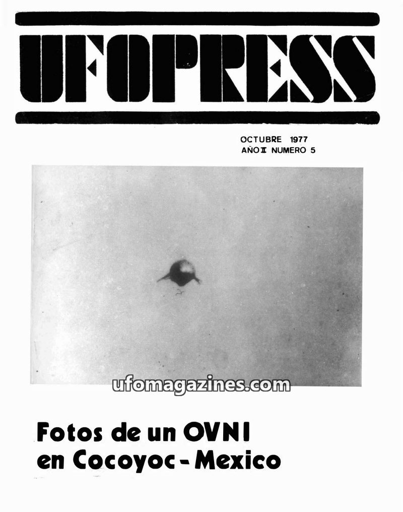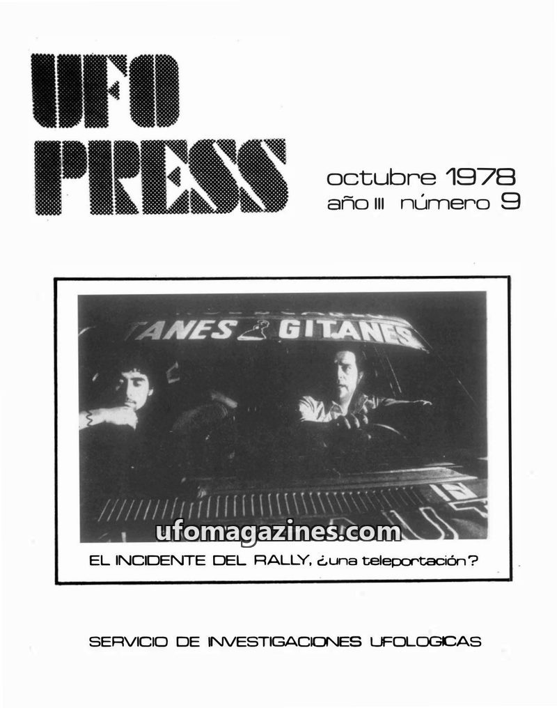This issue of UFOPRESS from October 1977 includes an article analyzing 181 UFO sightings in Spain during 1974 and their correlation with magnetic declination anomalies, concluding