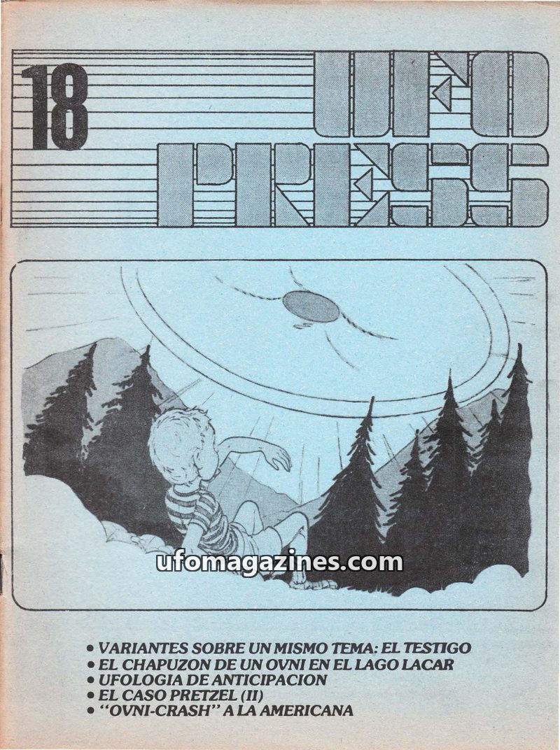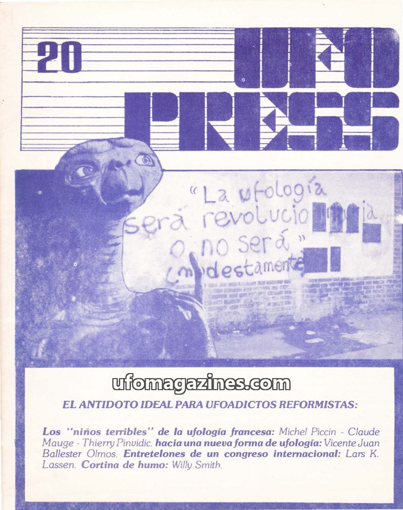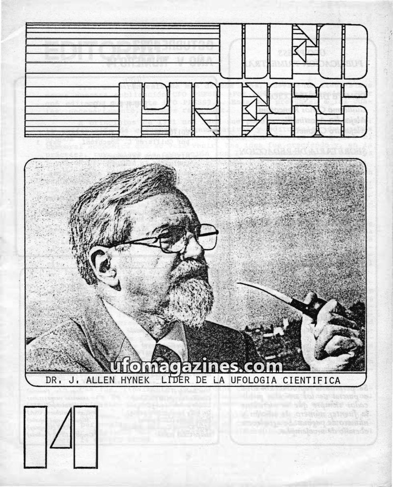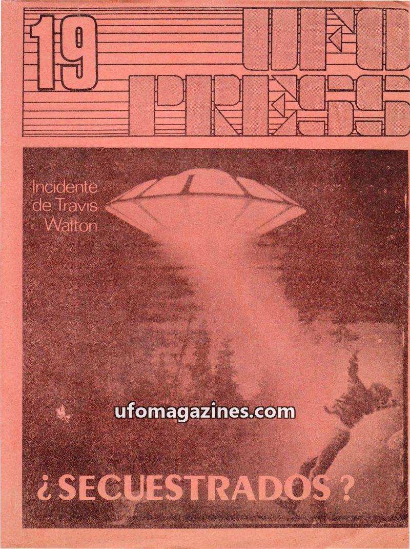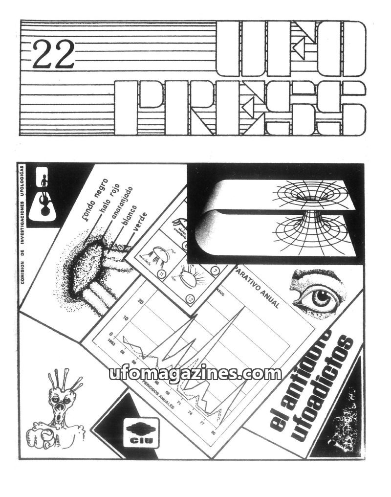 This issue of UFOPRESS from October 1977 includes an article analyzing 181 UFO sightings in Spain during 1974 and their correlation with magnetic declination anomalies, concluding