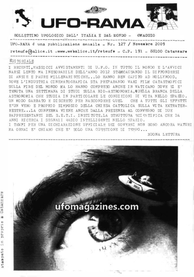 This issue of UFO-RAMA from November 2009 covers a range of topics including recent mass UFO sightings worldwide, the growing anxiety around the 2012 apocalypse, and the Vatican's