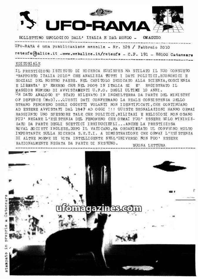 The February 2010 issue of UFO-RAMA highlights a significant increase in UFO sightings in Italy during 2009, as reported by Eurispes. The magazine also notes a similar trend in the