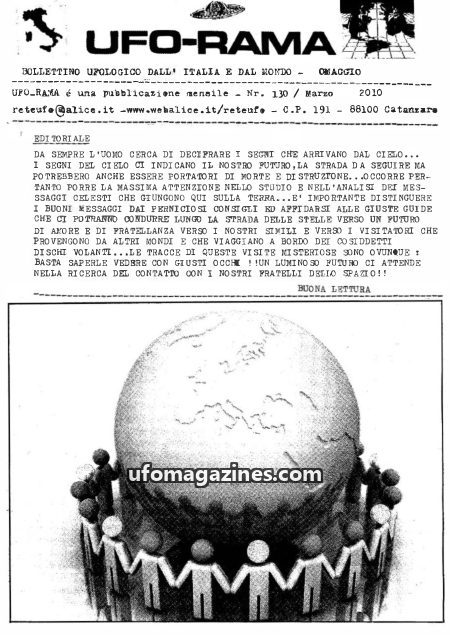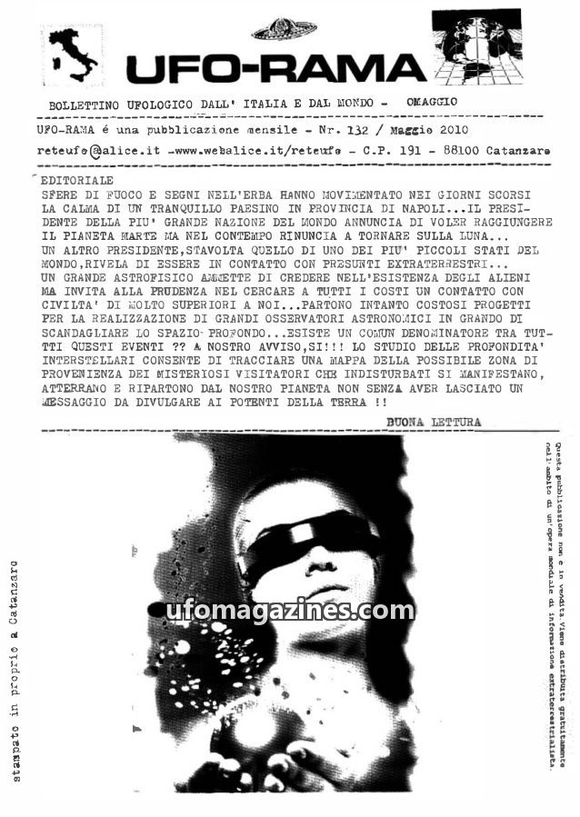 This issue of UFO-RAMA, dated May 2010, reports on a UFO sighting in Crispano, Italy, involving spheres of fire and crop circles. It also discusses US President Barack Obama's deci