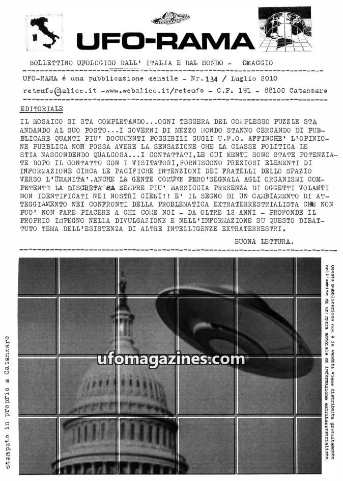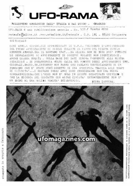 This issue of UFO-RAMA, dated June 2010, focuses on numerous UFO sightings reported across Italy. It highlights the anniversary of the Kenneth Arnold sighting and discusses the ong